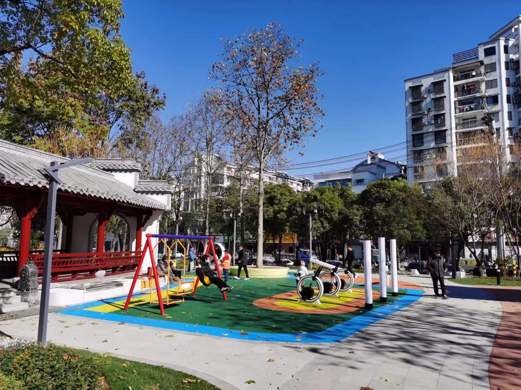 公園內(nèi)布置有健身活動(dòng)區(qū)及兒童游樂區(qū),新增了太陽能健身器材、無動(dòng)力單車、 七彩秋千、七彩蹺蹺板,修繕一新的景觀閑亭和長(zhǎng)廊為周圍居民提供休憩場(chǎng)地。園區(qū)內(nèi)還增設(shè)了智慧座椅和全市第一個(gè)裝配式智慧公廁,在打造智慧公園的同時(shí),為市民提供了直飲水、公廁、休憩空間等便民服務(wù)。夜間采用感應(yīng)花瓣燈、報(bào)樹燈、飄影燈、投影燈、草坪燈、霧森等燈光效果,對(duì)園路、擋墻進(jìn)行亮化布置,打造了游園夜間獨(dú)特景觀效果;綠化景觀以藍(lán)色“無盡夏”繡球花為主基調(diào),增加花境布置,在每年6-9月可呈現(xiàn)出一座美麗花園。